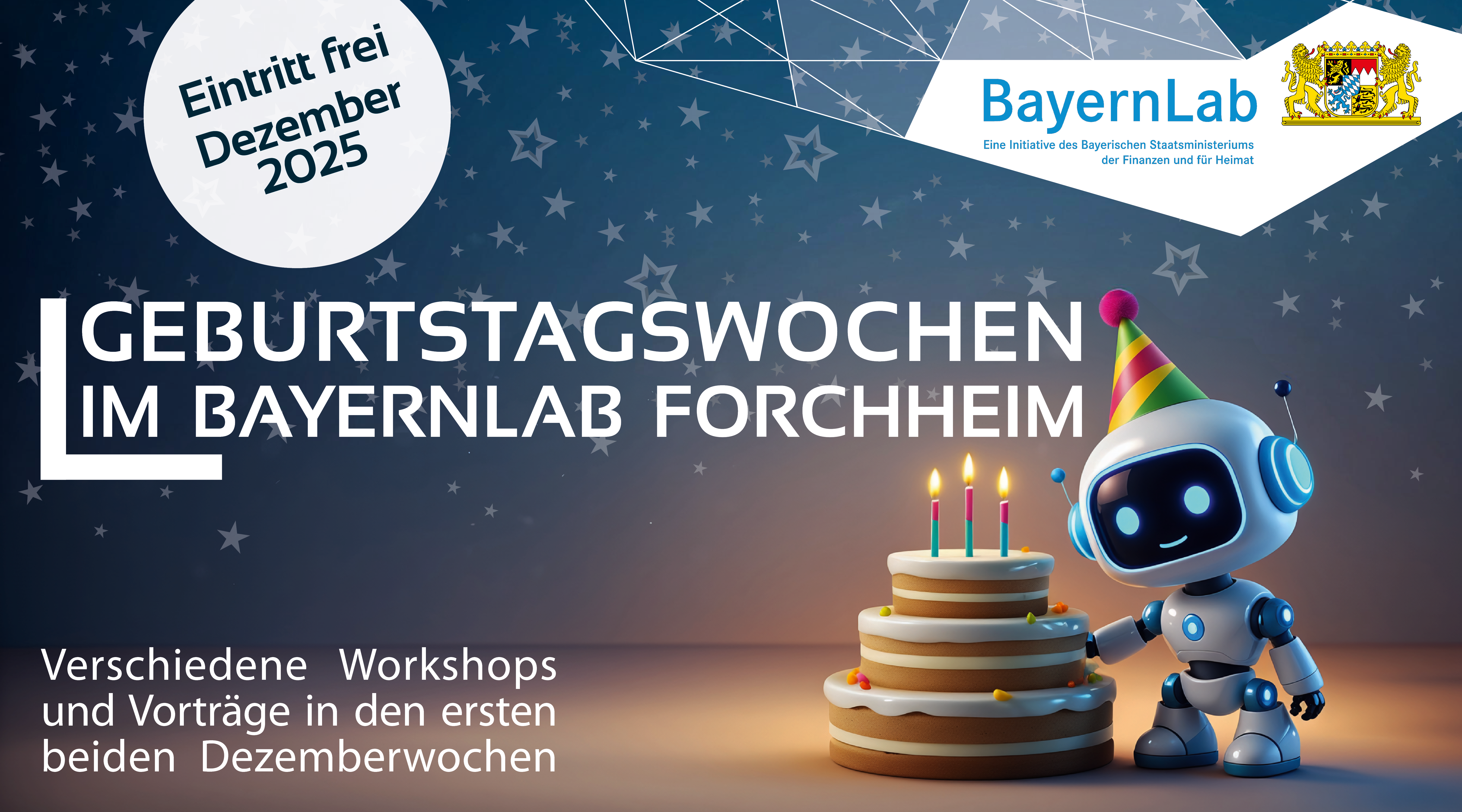 Am 05. Dezember 2025 feiert das BayernLab Forchheim bereits seinen dritten Geburtstag. Zu diesem besonderen Anlass laden wir Sie herzlich ein, an verschiedenen Workshops und Vorträgen in den ersten beiden Dezemberwochen teilzunehmen. Nutzen Sie die Gelegenheit, um sich über innovative Technologien und digitale Trends zu informieren oder einfach mal etwas Neues auszuprobieren. Wir freuen uns auf Ihr Kommen und darauf, mit Ihnen unseren dritten Geburtstag zu feiern!
